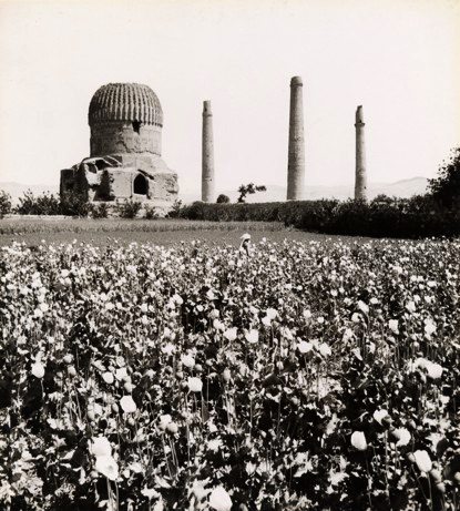 دو مناره ديگر بر اثر زمين لرزه سال ١٩٣١ فرو ريخت. در دوره بازديد "بايرون" از هرات هنوز هفت مناره هرات باقی بود. وی همين مناره ها را "باشکوه ترين نمونه های معماری محمدی (اسلامی) سده ١٥" عنوان کرده بود. اکنون، پس از حمله شوروی به افغانستان، تنها پنج مناره هرات باقی مانده است. در پيش نمای اين عکس مزرعه خشخاش را می بينيم. تاريخ اين عکس ماه مه سال ١٩٣٤ است.